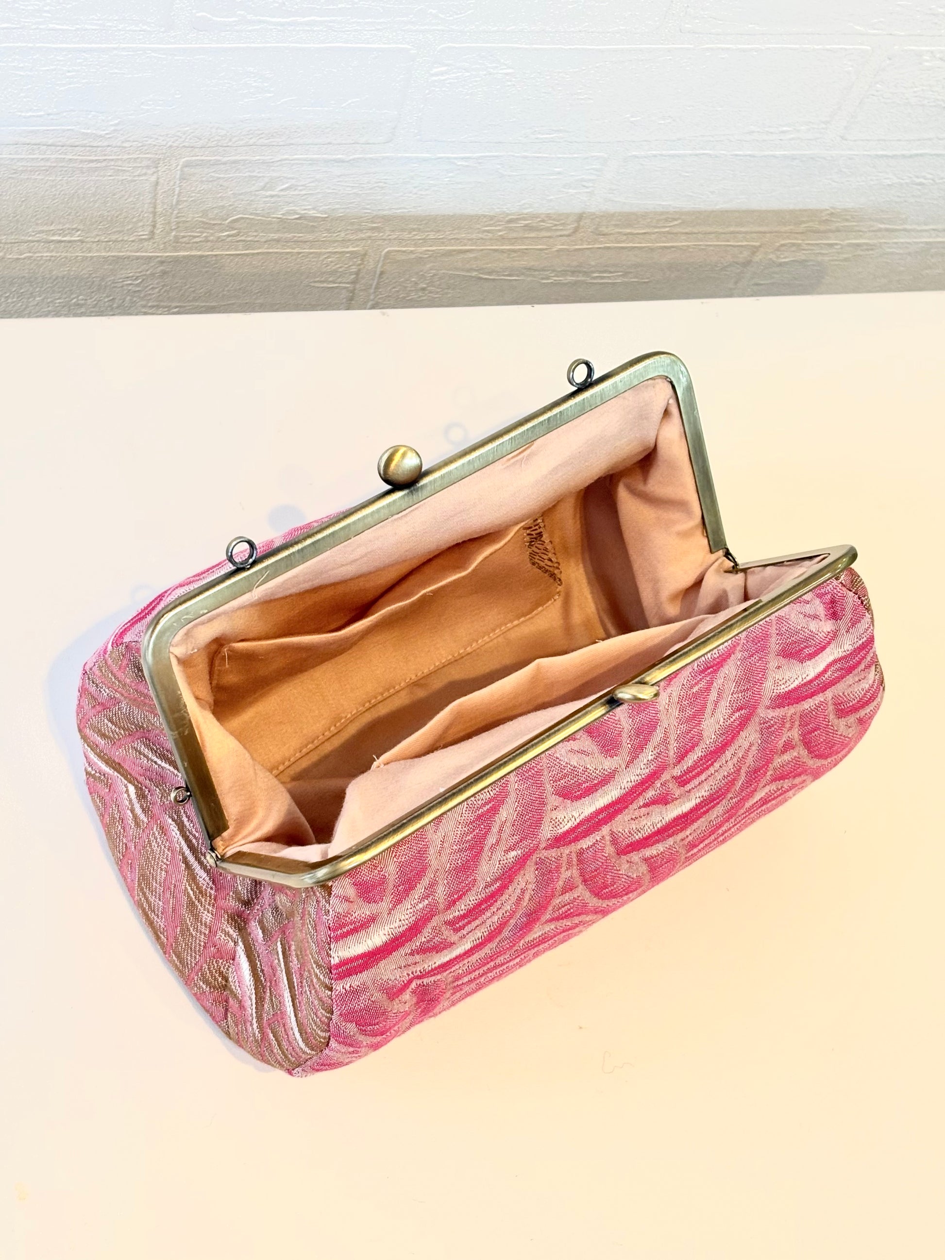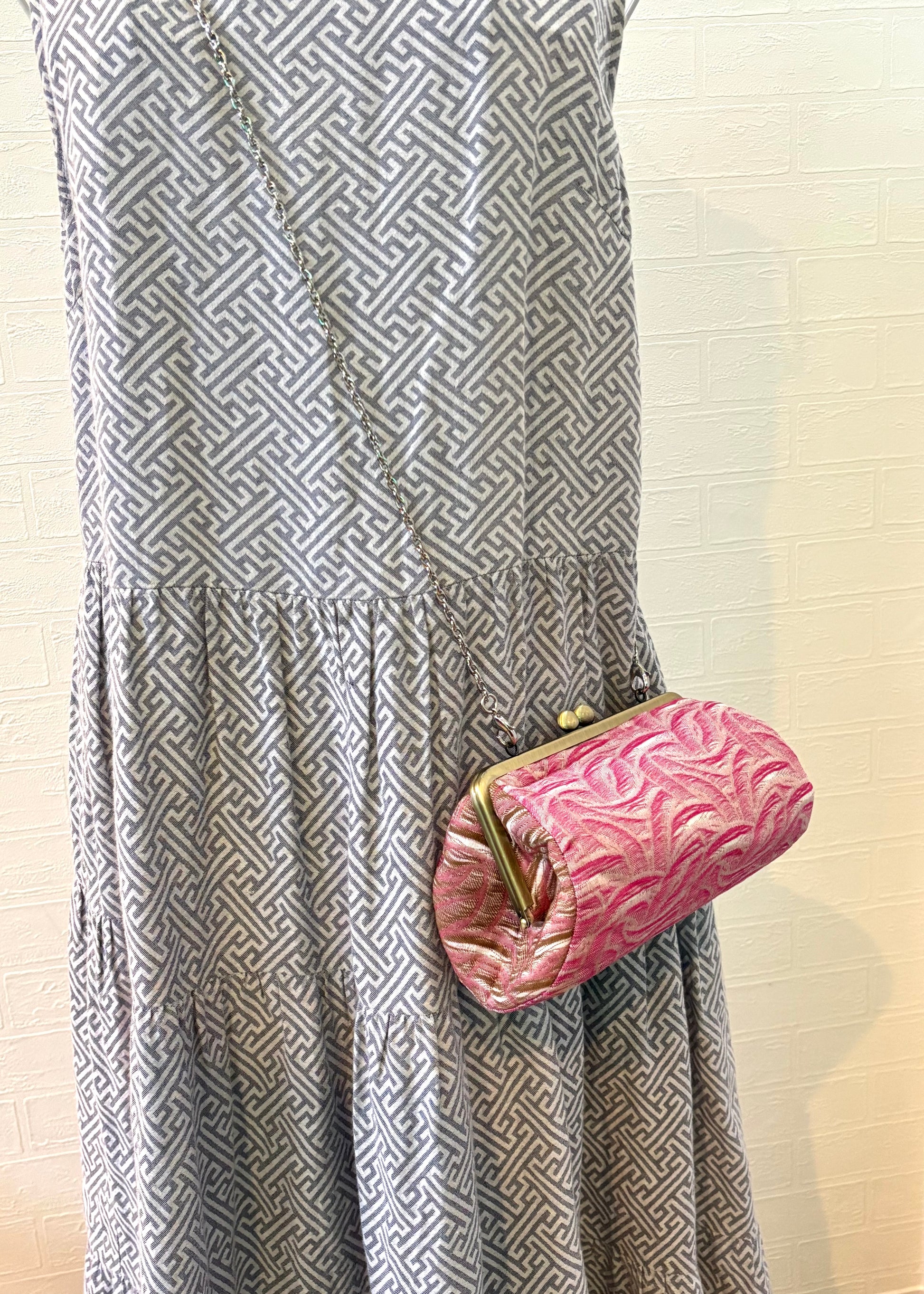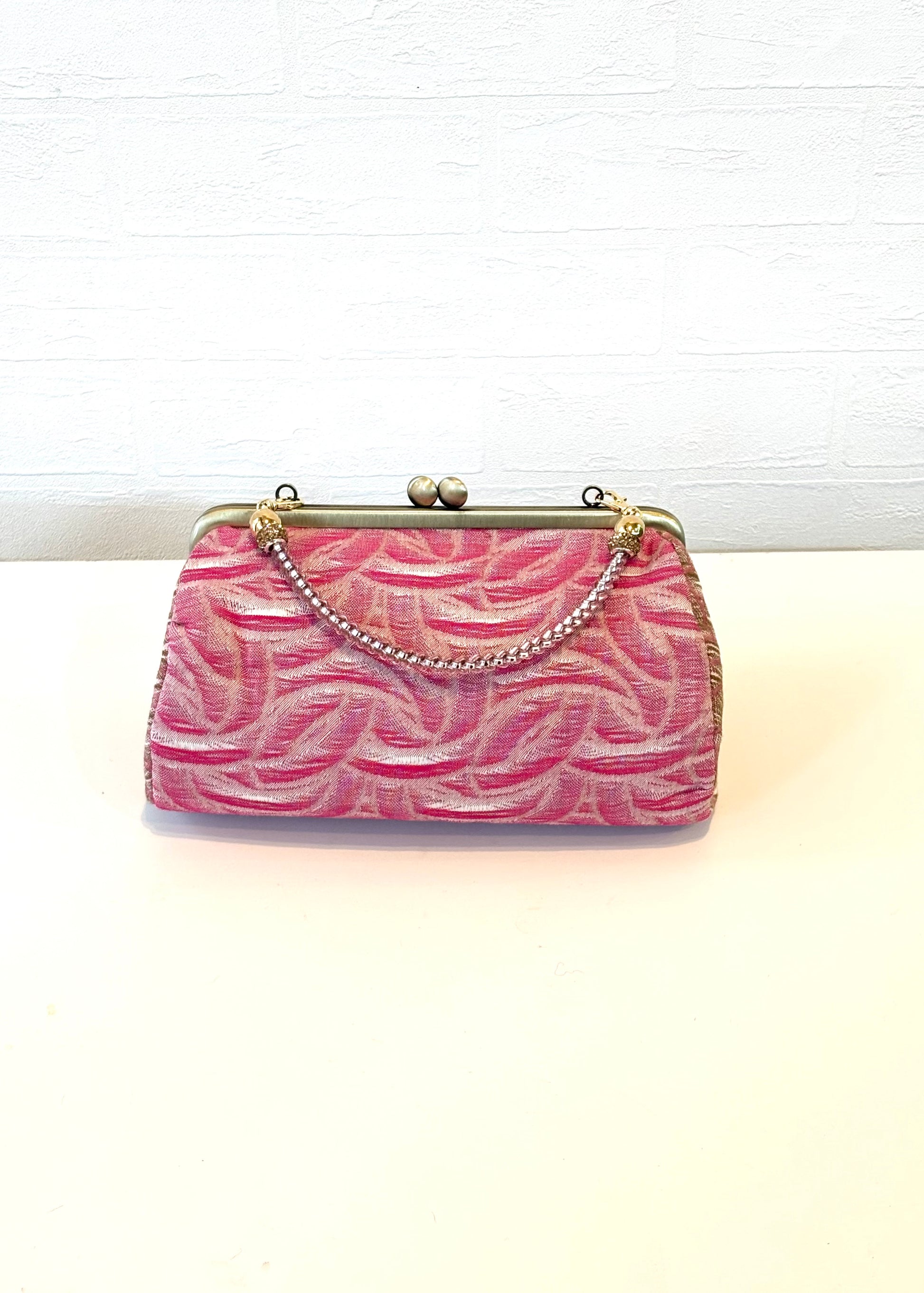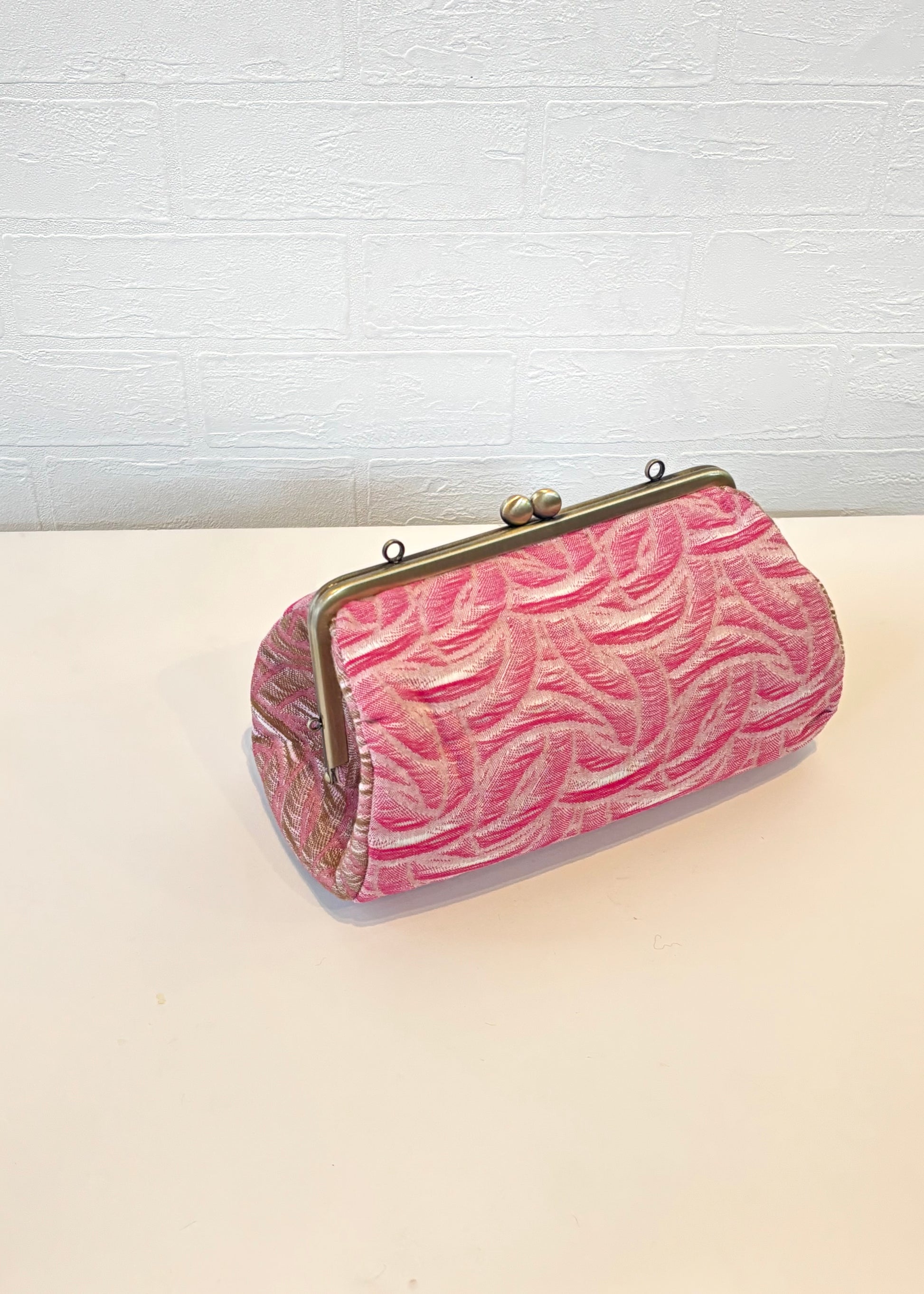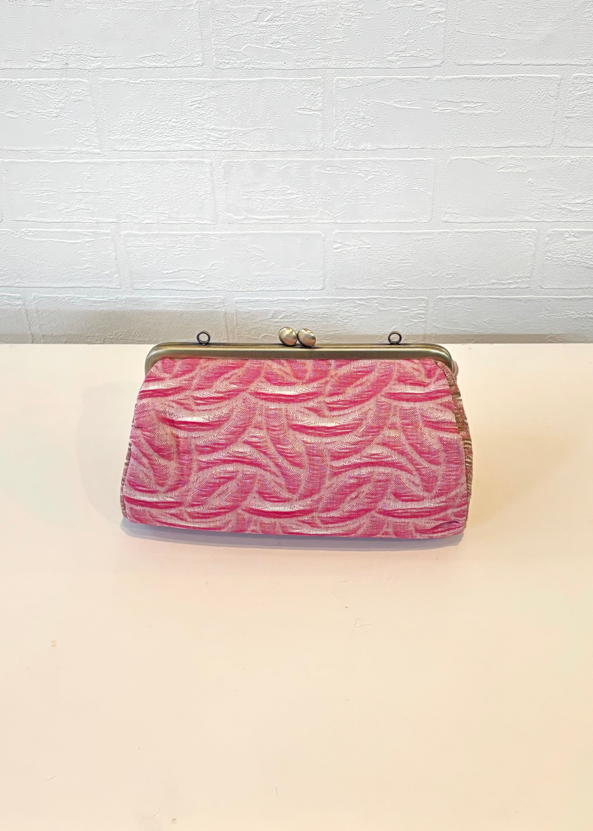 やさしいピンクの色彩に、流れるような織り柄が印象的な播州織のがま口ポーチ。